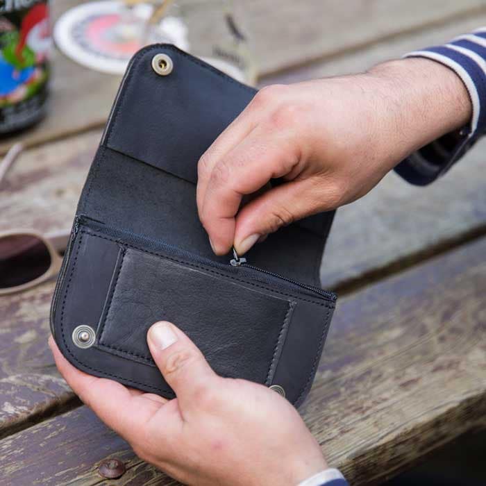 Un premier compartiment avec fermeture à glissière, pour stocker votre monnaie. Un second, sous forme de pochette et situé au dos du rabat, vous permet d’y glisser vos papiers. Un porte-carte situé à l’avant, et enfin, un large compartiment pour… ce que vous voudrez : vos clés, vos mouchoirs en papier,ou encore votre paquet de tabac.