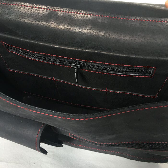 La couleur des coutures (bleue sur le sac en cuir marron et rouge sur le noir) amène une finition exemplaire.
